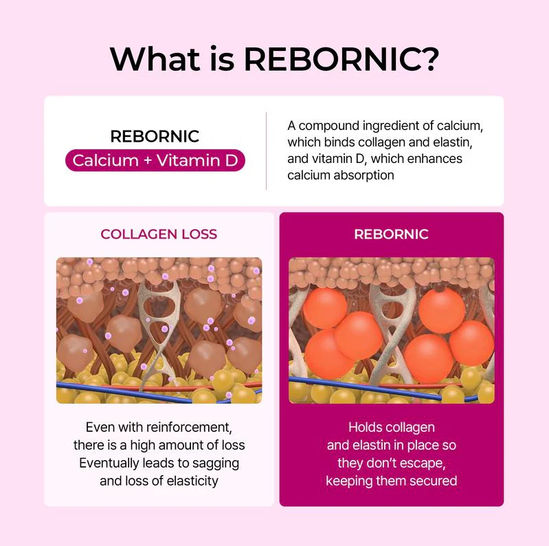 Rebornic Calcium complex boosts elasticity, helping lift sagging eyelids and refresh droopy eyes in minutes.